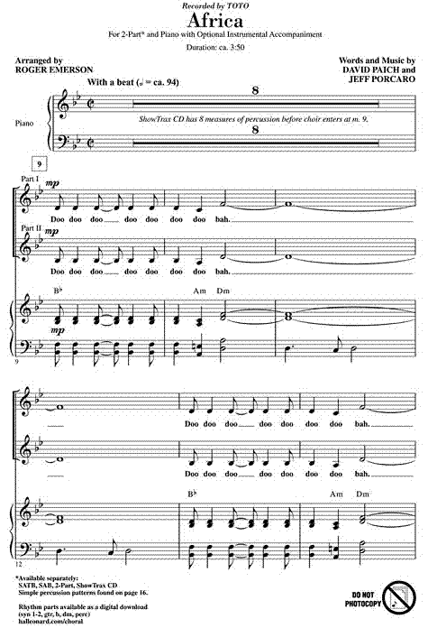 Otros detalles/contenidos Millions saw the amazing YouTube performance of Toto's Africa by the Slovenian choir Perpetuum Jazzille as they recreated the sounds of a rainstorm solely with body percussion. This accessible arrangement will allow your choir to wow your audience the same way! Includes simple percussion part.