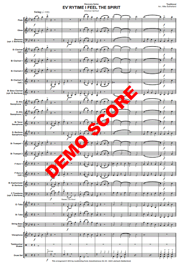 Otros detalles/contenidos "Ev'ry Time I Feel the Spirit" es una canción gospel clásica cuya poderosa melodía y letra inspiradora han recibido una nueva dimensión gracias al arreglo de Mike Sutherland para conjunto de viento. Sutherland logra preservar la esencia del original y al mismo tiempo explotar al máximo las posibilidades sonoras de un conjunto de viento. El resultado es una interpretación conmovedora y dinámica que resalta tanto la profundidad espiritual como la belleza musical de la canción.