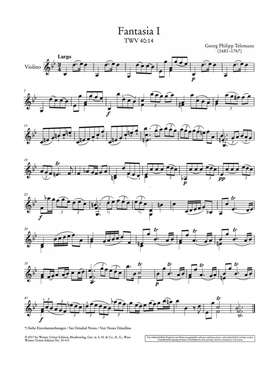 Otros detalles/contenidos The 12 Fantasies were part of a total of 72 fantasies for various instruments written by Telemann in the 1730s. Editor Bernhard Moosbauer calls them “true gems” and “carefully modelled jewels,” and is happy to discuss the form factor and espressivity of this “important and exemplary contribution” to the instrument. He might even argue their worth against the overshadowing Sonatas and Partitas by J.S. Bach. Moosbauer has consulted the first print and a contemporary complete manuscript copy to assemble his urtext of the 12 Fantasies, including a thorough background and discussion of the works, along with critical notes. As always, attention is given to page layout to produce a pracitcal performance score.