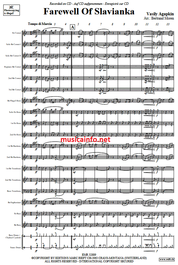 Otros detalles/contenidos La combinación de la melodía atemporal de Agapkin y el ingenioso arreglo de Moren hacen de "Farewell of Slavianka" una obra excepcional para orquestas de viento y bandas de música de escuelas secundarias. La composición sigue siendo un testimonio vivo del poder de la música para combinar dimensiones históricas y emocionales, ofreciendo a músicos y oyentes una experiencia conmovedora.