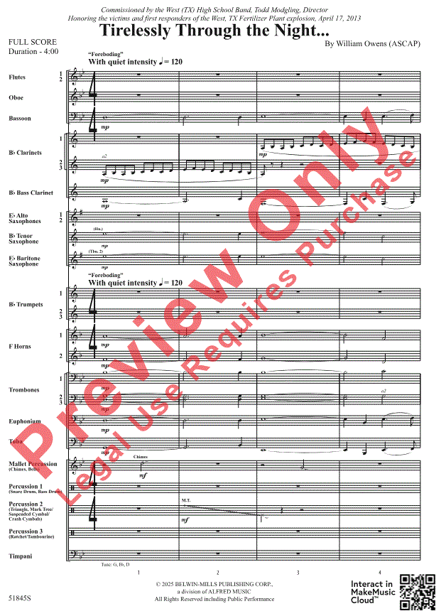 Otros detalles/contenidos La poderosa obra programática de William Owens, Incansablemente a través de la noche..., es una representación musical de la explosión que devastó una pequeña comunidad texana. Con un comienzo suave y conmovedor, el "Presagio" se intensifica gradualmente a medida que se desata el caos destructivo de la "Crisis". Los segmentos "Consecuencias" y "Regénesis" ofrecen esperanza y consuelo tras la tragedia. ¡Música seria para conjuntos serios!