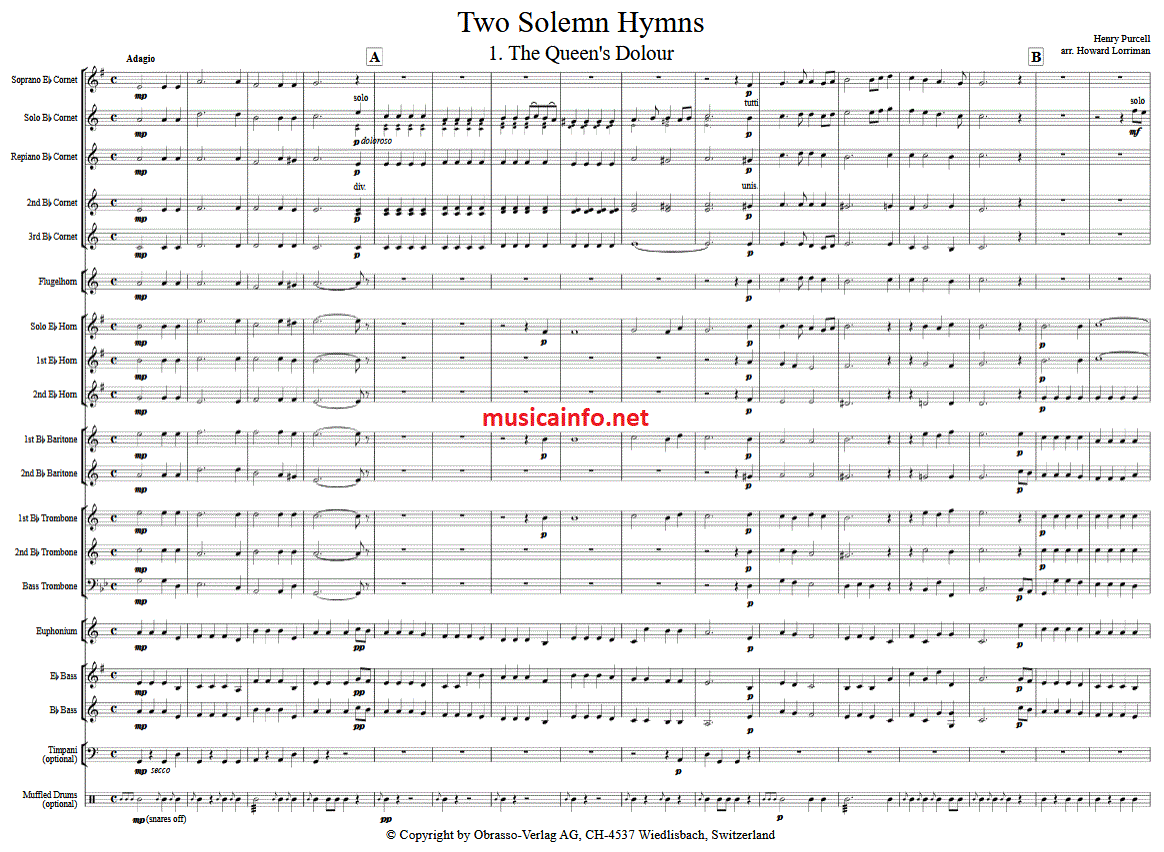 Otros detalles/contenidos El arreglo de Howard Lorriman de "The Queen's Dolour" de Henry Purcell y "Abide With Me" de William Henry Monk en "Two Solemn Hymns" combina dos obras de gran importancia musical e histórica en una composición estilísticamente exitosa para orquesta de viento y banda de metales. Los arreglos conservan la expresividad característica de los originales y amplían su gama de efectos gracias a los timbres específicos de los instrumentos de viento. Para las bandas de viento, esta obra constituye una valiosa adición al repertorio de música sacra y de celebración.