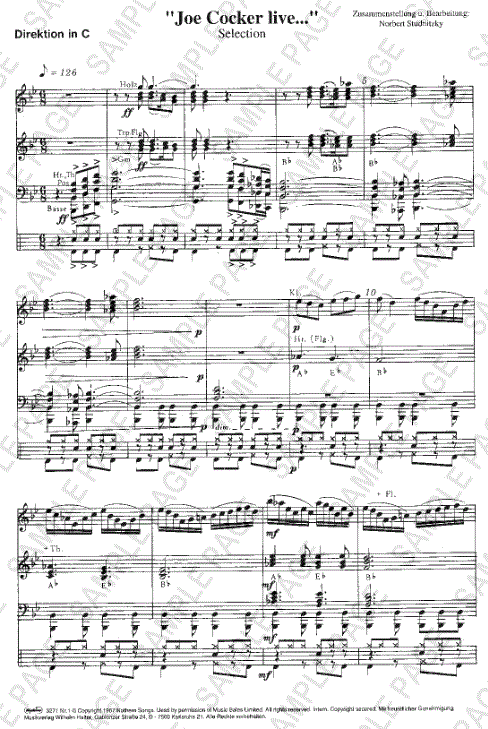 Otros detalles/contenidos El popurrí de Norbert Studnitzky "Joe Cocker Live" es un exitoso homenaje a uno de los más grandes músicos de rock y blues del siglo XX. Las canciones seleccionadas reflejan la versatilidad y expresión única de la voz de Joe Cocker, y el arreglo para banda de concierto lleva la profundidad emocional y la poderosa dinámica de su música a un nuevo nivel. El Popurrí requiere que los músicos tengan habilidad técnica, expresividad y un profundo conocimiento de la música de Cocker para poder capturar el espíritu de sus presentaciones en vivo y llevarlas a la sala de conciertos.