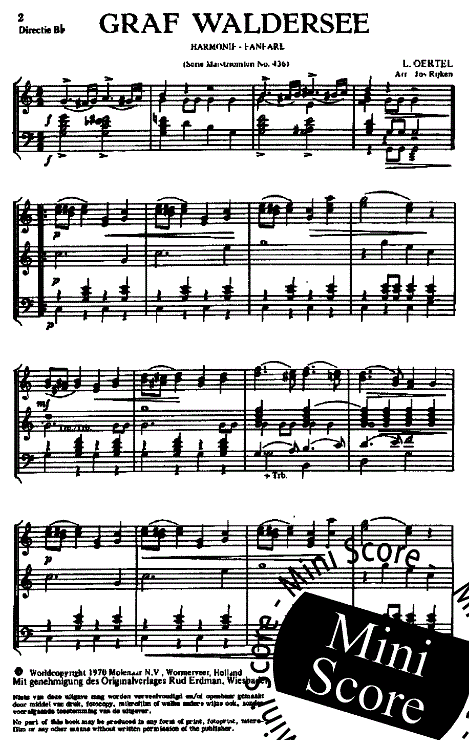 Otros detalles/contenidos Alfred von Waldersee (1832-1904) fue un importante mariscal de campo alemán que se distinguió por su liderazgo militar y su experiencia estratégica en el Imperio alemán. En su honor, Louis Oertel compuso la marcha "Graf Waldersee", que refleja la personalidad y la importancia militar de Waldersee mediante elementos musicales potentes y elegantes. Esta obra, técnicamente exigente y atractiva para el público, ofrece a las bandas de música la oportunidad de combinar la remembranza histórica con la calidad musical.